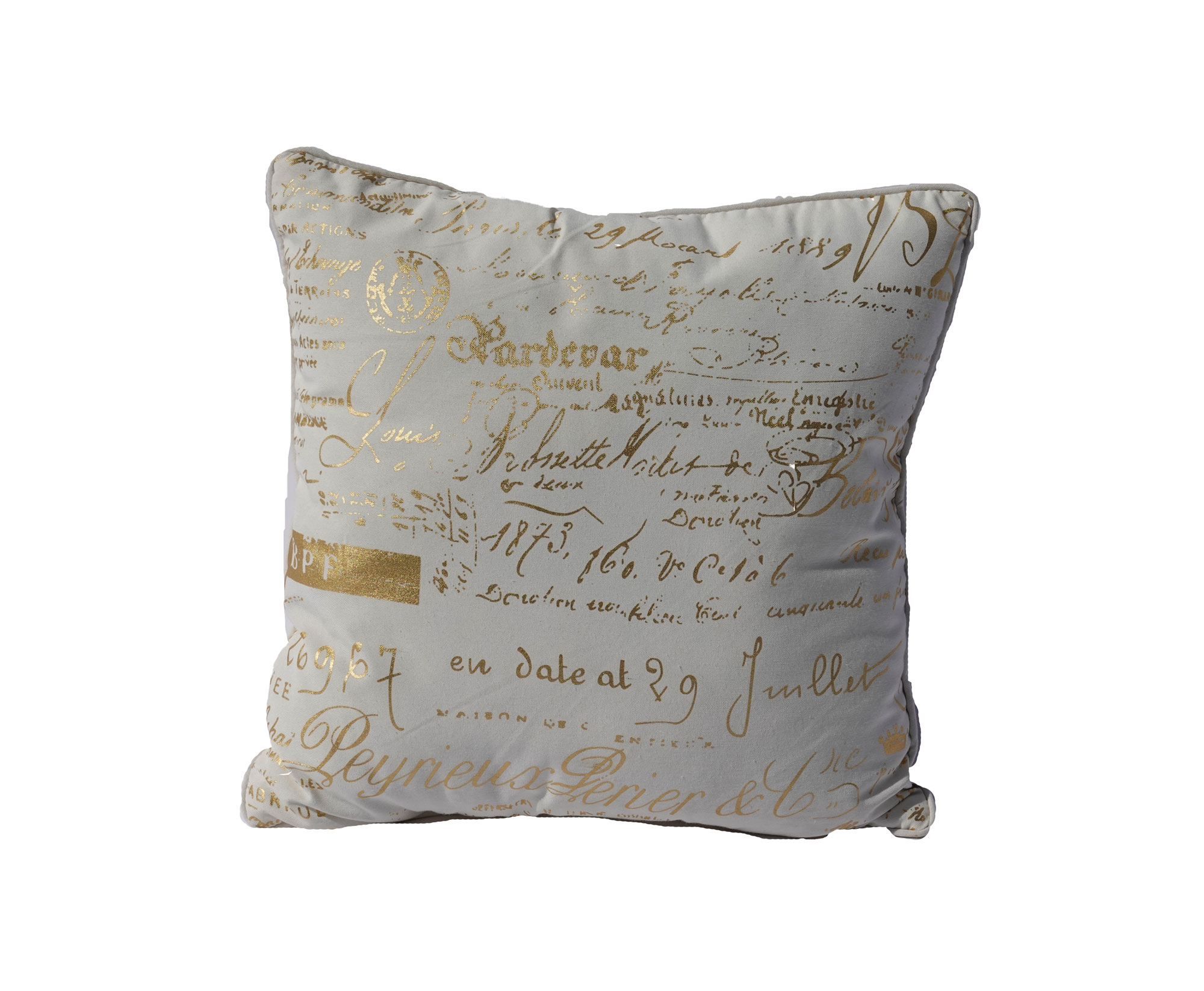 Collection Textiles Gold Script Pillow Search View Wishlist Gold Script Pillow Price: $8.00 Description: off-white pillow with elegant gold writing detail. Quantity: 1 Tags: gold, elegant, glam, pillow Add to Wishlist