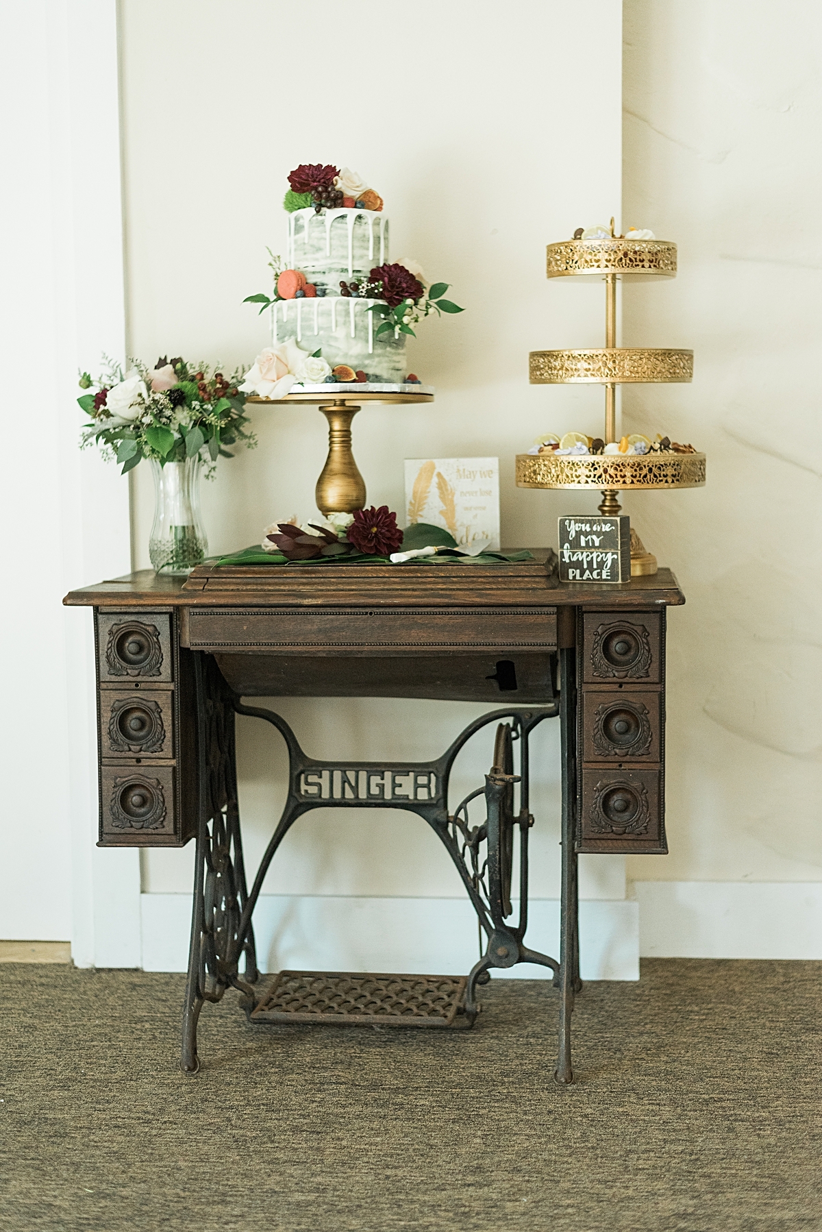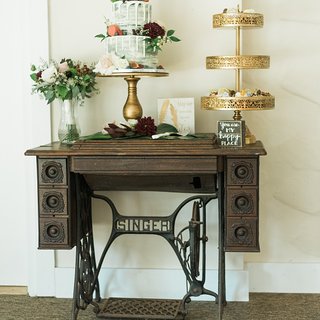Cast iron base with a wooden top adds that perfect vintage feel to a welcome drink station, memory table or guestbook.