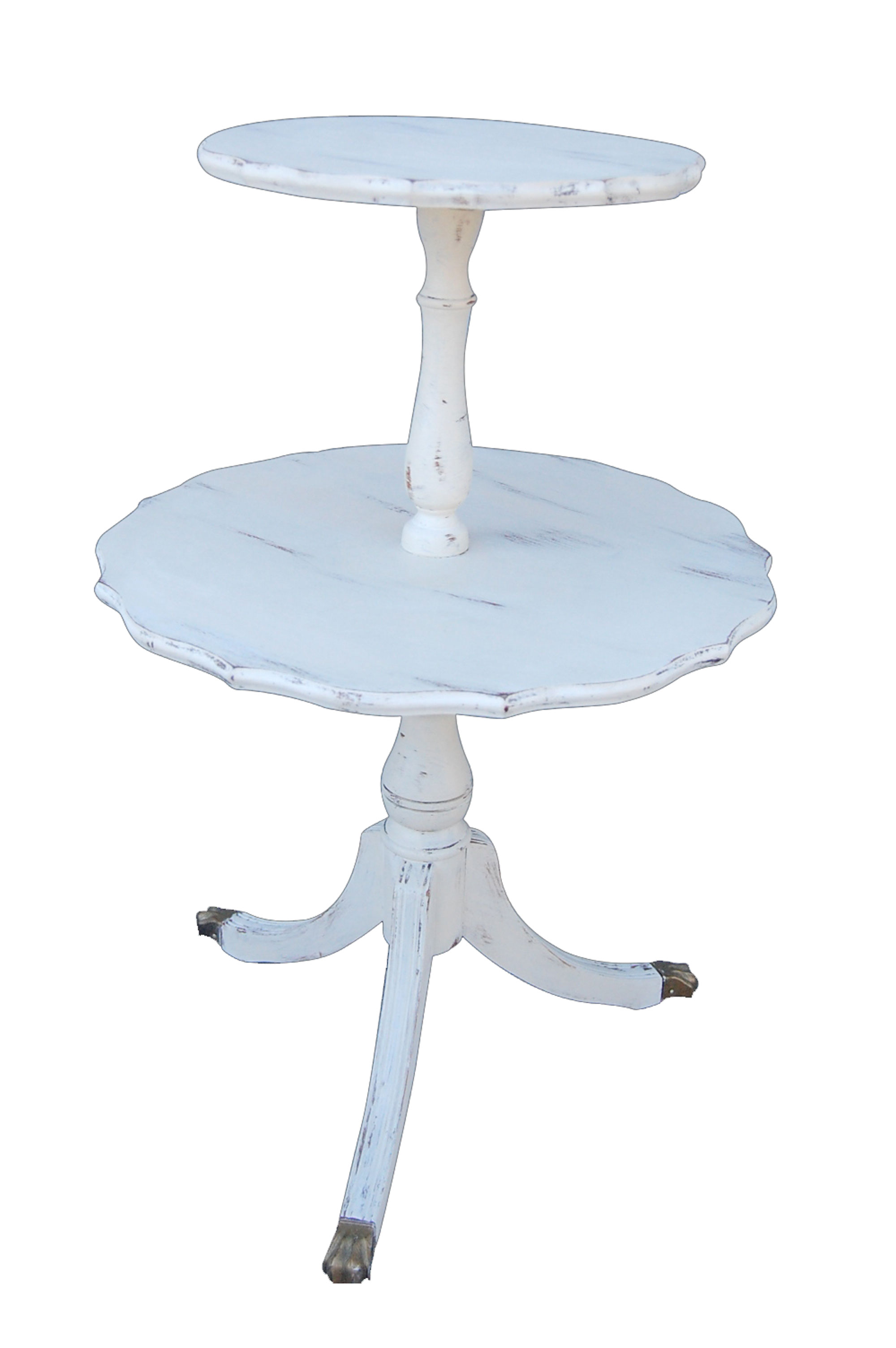 Collection Side Tables & Coffee Tables White Pie Table Search View Wishlist White Pie Table Price: $20.00 Description: White Distressed 2 tier side table Quantity: 1 Tags: white, romantic, wood, coastal, chic, farmhouse, side table, distressed Add to Wishlist